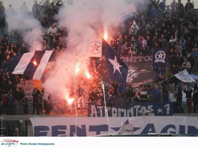 Для многих фанатов образцом ULTRAS-движения до сих пор являются фанаты Англии или Германии. Конечно же это не так. Эти страны потеряли лидерство. Нельзя говорить о фанатизме когда на трибунах никто не кричит, никто не стоит, когда на матчах-дерби фанов разделяет всего лишь 2-3 мера и один ряд ментов… Я постараюсь рассказать о греческом фанатизме и передать всю его красоту и неповторимость. В греческом футболе есть четкое разделение на “большие” (Олимпиакос, Панатинаикос, АЕК- команды из Афин, ПАОК, Арис, Ираклис - команды из Салоник) и “маленькие” команды, это же разделение прослеживается и в УЛЬТРА движении, за небольшими исключениями. Фанаты объединяются в ФАН-КЛУБЫ, обычно по географическому принципу. В каждом районе города фанаты организовывают фан-клубы, делая взносы каждый месяц (3$), арендуют помещение, оформляют его соответственно, собираются там для просмотров или просто отвиснуть.Фан-клубы -организации официальные, и имеют связи и влияние на руководство клуба, (как пример можно привести тот факт, что несколько лет назад именно фанаты ПАОКа заставили уйти в отставку тогдашнего президента команды, преследуя его, собираясь тысячами перед его домом, закидывая окна камнями, поджигая его машины). Нечто подобное творится и болелами Ираклиса в эти дни)