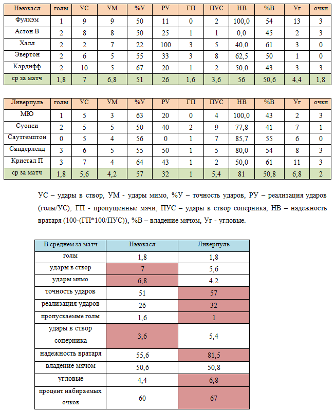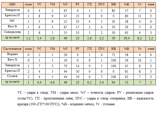 С возвращением Суареса на поле нападение «Ливерпуля» засверкало новыми красками. Было отгружено по 3 мяча «Сандерленду» и «Кристал Пэлас», а с учетом того, что оборона «Ньюкасла» не отличается особой надежностью, фактически каждый второй удар в створ влетает в сетку (56%), то с уверенностью можно говорить, что хозяева пропустят. Скорее всего, в этом матче будет забито больше двух мячей, так как и те и другие редко уходят «сухими». Что же касается фаворита, то им является «Ливерпуль», но обратите внимание, что «Ньюкасл» в среднем наносит большее количество ударов (14 против 10), то есть хозяева создают моментов больше, чем гости, но их подводит реализация (26% против 32%). Наиболее разумными ставками были бы ТБ(2,5) и обе забьют.