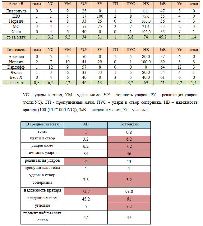 В «Тоттенхэме» собралась очень симпатичная банда, но ей пока не хватает стабильности и холодной головы. Игроки «шпор» испытывают просто катастрофические проблемы с реализацией своих моментов, они в среднем за матч наносят по 6 ударов в створ, а забивают меньше гола за игру (0,8), в итоге получается, что только 13 % попаданий в створ становятся голами. Для сравнения у «Астон Виллы» каждый 3 выстрел в створ изменяет счет на табло (31%). Это наиболее сложный для прогноза матч, так как у команд очень схожие показатели, но все-таки подопечные Виллаш-Боаша более агрессивны в атаке (13 ударов против 9) поэтому, если и ставить на победителя, то лучше положиться на «Тоттенхэм», впрочем, ничейный исход не должен никого удивить.