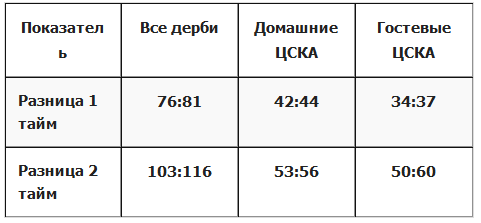 Если рассмотреть результативность команд по таймам, то и по этому показателю ЦСКА уступает «Спартаку». Таблица ниже демонстрирует это.