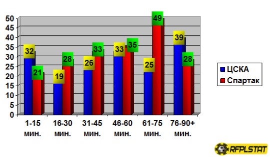 На 90-й минуте и в компенсированное время команды забивали друг другу мячи 8 раз – 6 мячей забили армейцы и 2 — спартаковцы. Причем для ЦСКА в четырех случаях эти мячи оказывались решающими: дважды забитые в концовках мячи приносили ничью (мячи Д.Янчика и А.Дзагоева с пенальти) и еще 2 раза становились для ЦСКА победными (мячи И.Ярошика и Вагнера).