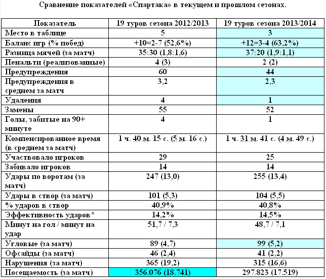 «Спартак». Третье место в промежуточной таблице чемпионата. Команда очень любопытная с точки зрения технических результатов после 19 туров. Их и рассмотрим. Для начала — таблица с основными показателями «Спартака» после 19 туров в сравнении с аналогичным периодом прошлого сезона.