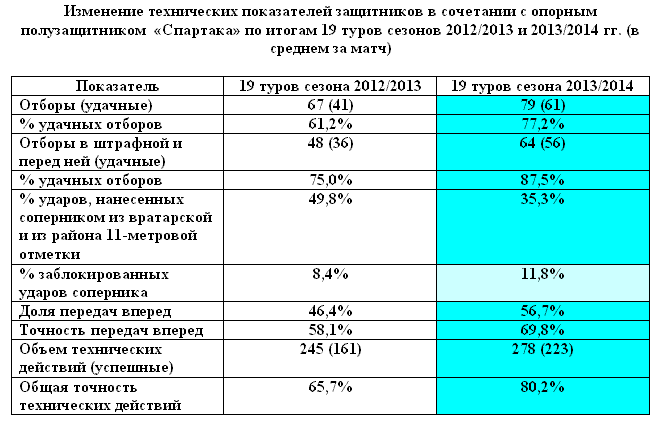 Таким образом, несмотря на голословные в большей части утверждения о слабости обороны «Спартака», цифры свидетельствуют об обратном. Налицо явное усиление игры защиты в текущем сезоне. Кроме того, оборона, в отличие от других линий команды, во вторых таймах встреч улучшает процент своих успешных технических действий, поднимая его до отметки 81,4% против 79% по итогам первого тайма. Для сравнения: общекомандный процент успешных технических действий во вторых таймах как раз снижается с 76,7% до 68,9%.