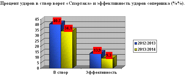 Лишнее подтверждение эффективности работы обороны — диаграмма, отражающая динамику процента ударов в створ, нанесенных по воротам «Спартака» и эффективности этих ударов соперника. В текущем чемпионате «Спартак» значительно реже допускает удары соперника в створ собственных ворот и значительно понизил эффективность этих ударов.