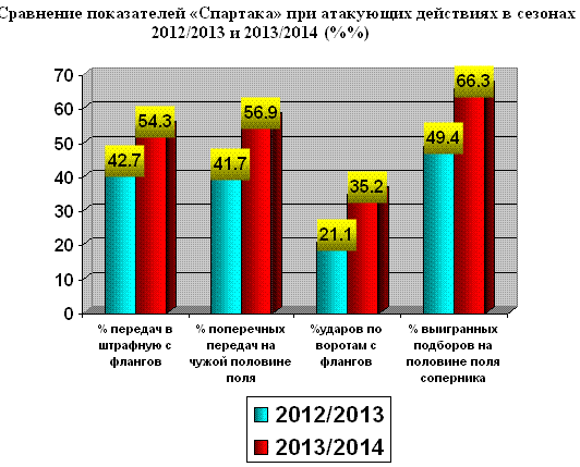 На диаграмме отражены практически все ключевые изменения, которые претерпели атакующие действия «Спартака» в текущем сезоне. Во-первых, больший, чем это было ранее, акцент сделан на фланговую игру команды. И это проявляется не только в возросшем количестве передач, выполненных в штрафную соперника с флангов атаки, но также более чем в полтора раза увеличившемся числе ударов по воротам соперника, произведенных из боковых квадрантов штрафной площади и из фланговых зон поля. Кстати, 60,0% всех своих ударов по воротам (153 из 255) футболисты «Спартака» нанесли из пределов штрафной площади соперника, а 19,2% — из вратарской соперника. В прошлом сезоне только 51,4% ударов были выполнены из штрафной площади соперника. То есть, при атакующих действиях команды прослеживается акцент на проникновение в штрафную площадь противоборствующей команды. Тот факт, что возросло количество поперечных передач на чужой половине поля свидетельствует с одной стороны о некотором замедлении атакующего темпа команды, но, с другой – об улучшении контроля мяча в атаке и стремлении как можно дольше его контролировать. Кстати, выросший по сравнению с прошлым сезоном показатель выигранных на чужой половине поля единоборств – также прямое свидетельство стремления сохранить мяч у себя, а при его потере – немедленно предпринять действия по овладеванию им. Агрессивным стилем игры в немалой степени объясняется высокий показатель совершаемых нарушений правил (команда находится в топ-5 самых недисциплинированных коллективов Премьер-лиги).