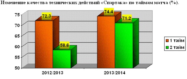 Игру команды в текущем сезоне характеризует также отсутствие выраженного западения технических результатов по ходу встречи. В прошлом сезоне качество выполняемых действий снижалось во вторых таймах гораздо сильнее, чем это происходит сейчас. На протяжении первой части чемпионата «Спартак» проводил оба тайма, практически не ухудшая процент успешных технических действий во вторых таймах. На диаграмме представлена динамика процента успешных технических действий команды в сравнении с аналогичным отрезком прошлого сезона. Анализу подвергались отборы, перехваты, блокировки ударов, прерывания передач, попытки ведения мяча, финты, передачи, совершенные игроками команды.