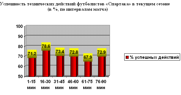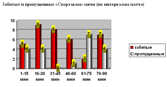 - в разрезе матча существуют интервалы времени, в течение которых «Спартак» выдает наилучшие (середина первых таймов) и наихудшие (середина вторых таймов) результаты;