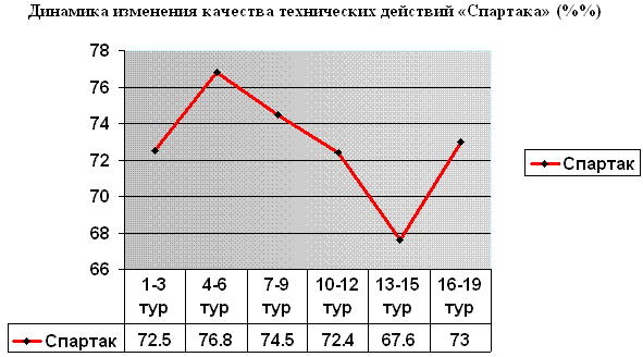 Начав сезон с достаточно неплохим показателем качества общекомандных действий, первую треть пройденной уже турнирной дистанции «Спартак» только наращивал качество своей игры. Однако после 6 тура начался затяжной спад характеристик, которые достигли минимума на промежутке 13-15 туров. С началом второго круга первенства вновь начался прирост показателя качества выполняемых технических действий. Подобный Z-образный график динамики качественных показателей свидетельствует о том, что функциональная готовность команды не в полной мере программировалась при подготовке к сезону и была не абсолютно управляема тренерским штабом, поскольку быстрое достижение пиковых показателей в начале турнира сменилось затем достаточно долгим периодом регрессии значений, а наметившийся вторичный подъем показателей был прерван зимним перерывом.