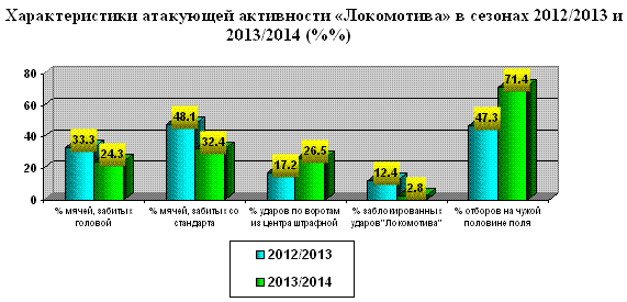 Говоря об атакующих действиях, отметим, что в основе их опять-таки лежит повышенный по сравнению с прошлым сезоном объем работы. Более чем на 17% возрос объем технических действий «Локомотива», осуществляемых в матче (с 641 до 774); практически вдвое (с 49 до 87) выросло число ведений мяча и обводок соперника в матче. Показательна следующая диаграмма, которая отражает изменение в характере наносимых по воротам соперника ударов.