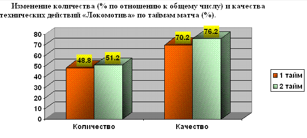 Говоря об изменении игровых характеристик «Локомотива», нельзя не отметить одной детали, показывающей высокую степень физических кондиций команды в сезоне. «Локомотив» — единственная команда чемпионата, которая во вторых таймах встреч прибавляет не только в количестве выполняемых действий, но также улучшает процент их успешного выполнения. То есть «железнодорожники» интенсивнее и качественнее проводят вторые таймы своих встреч. В отдельных матчах сезона это удавалось «Зениту» и «Спартаку», но «Локомотив» демонстрирует увеличение количества и качества действий во вторых таймах за исключением трех случаев постоянно. Еще одно доказательство тому – 70,3% своих мячей (26 из 37) команда забила именно во вторых таймах. Диаграмма ниже отражает изменение количественных и качественных показателей технических действий команды по таймам.