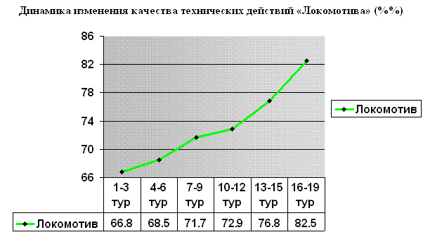 На первый взгляд, вроде бы фантастического изменения показателей «Локомотива» по сравнению с аналогичным периодом прошлого сезона не произошло. Однако команда, уступающая первую строчку таблицы только по результату личной встречи с лидером, обладает лучшей в лиге разницей забитых и пропущенных мячей; одним из лучших показателей эффективности ударов, а по числу пропущенных мячей уступает только «Рубину». В сравнении с предыдущим сезоном произошло разительное преображение коллектива. Причем оно по большей части не количественное (так, число ударов по воротам, количество угловых, даже число совершаемых нарушений правил. – эти показатели на аналогичном отрезке прошлого сезона были несколько лучше), а качественное. При в целом меньшем числе ударов по воротам процент попадания в створ и особенно эффективность реализации этих ударов повысились. 14,3% ударов по воротам завершились их взятием – сопоставимые показатели имеют только «Зенит» и «Спартак».