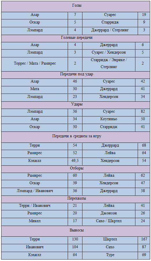 Опытнейший и нестареющий Лэмпард по-прежнему остается одним из лучших игроков команды. Фрэнк скорее всего выйдет в опорной зоне вместе с Микелом (Рамирес пропустит встречу из-за перебора желтых карточек). Лэмпард – это настоящий боец, он никогда не сдается и всегда выкладывается на полную катушку. Конечно, Фрэнк – это в большей степени игрок атаки, творец, он в этом сезоне забил 4 гола, отдал 3 голевые передачи, еще он создал для партнеров 23 момента и является лидером команды по количеству ударов по воротам – 36, при всем этом Лэмпард не отлынивает от черновой работы и с 36 отборами идет на 3м месте в команде по этому показателю.