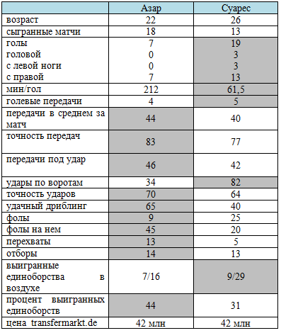 В целом, из таблицы выше мы видим, что Азар и Суарес имеют очень схожие показатели, это техничные игроки, способные как создавать моменты для себя, так и ассистировать партнерам. Но все-таки Луис заслуживает отдельных комплиментов, в нем прекрасно сочетаются навыки атакующего полузащитника с данными наконечника копья.