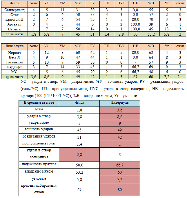 Из данных по последним 5 играм мы видим, что "Ливерпуль" превосходит оппонента практически по всем показателям. Особенно бросается в глаза тот факт, что гости забили в 2 раза больше мячей (18 против 9) и пропустили на 2 гола меньше, к тому же они в среднем за встречу наносят по 17,6 ударов в сторону ворот, в то время как у соперника только 12,8 выстрелов. Но делать скоропалительных выводов из данной статистики не стоит. Во-первых, "Челси" играет дома, а во-вторых, Моуринью в 2 последних матчах предпочитает плясать от своей печки. Он очень грамотно засушил матчи с "Арсеналом" и "Суонси", в которых хотя и был забит всего 1 гол, зато этого хватило, чтобы набрать 4 очка. Лондонцы не только не пропустили в этих 2 встречах, они позволили соперникам всего 3 раза попасть в створ ворот Чеха. Беря все это во внимание, следует признать, что предсказать ход данного поединка практически невозможно. Давайте просто поболеем за красивый футбол.