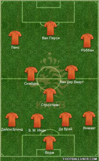 Мишель Ворм вроде как отвоевал первый номер у Тима Крула, Мартина Стекеленбурга и Ясслера Силленсена. Оборона, как уже было отмечено выше, полностью состоит из молодых ребят. Левого латераля также может самый юный участник Евро12 Виллемс, правого-Грегори Ван дер Виль, в центре есть Влаар и Брума. В полузащите нечасто получалось увидеть связку Снейдера и Ван дер Ваарта, но виной тому травмы кого-то из них. По очереди их подменяли Схаарс, Де Гузман и Фер. Кевин Строотман, проводящий блестящий сезон за Рому стал железным игроком основы и в сборной. В атаке вряд ли произойдут какие-то изменения, разве что в качестве джокера на острие выйдет Класс Ян Хунтелаар либо Люк Де Йонг.