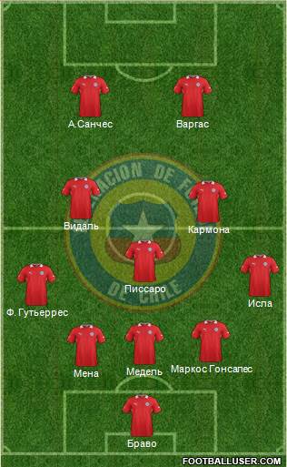 Безоговорочный первый номер и капитан-голкипер Реал Сосьедада Клаудио Браво. Номинальный опорник Медель играет либеро, его партнеры-футболисты бразильской Лиги Мена и Маркос Гонсалес (не путать с Марком). Есть также защитник Ноттингем Форрест Хара. Места латералей вряд ли подвергаются сомнению, Фелипе Гутьеррес из Твенте, а также Маурисио Исла из Ювентуса железные игроки основного состава. Мозг команды-опытнейший Давид Писсаро, перед ним располагаются также футболисты из итальянской Серии А Артуро Видаль и Карлос Кармона, которых может подменить атакующий полузащитник Вальдивия или одноклубник Писсаро Матиас Фернандес, который также может мыграть и на острие атаки. Линию нападения составляет сыгранная пара из Варгаса и Алексиса Санчеса. Вообще следует сказать, что Сампаоли часто тасует состав, поэтому предсказать оптимальное сочетание достаточно сложно.