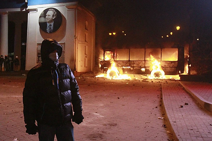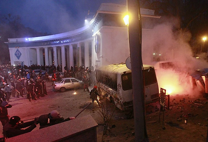 Одна из самых горячих точек бунта – площадь у стадиона «Динамо» имени Валерия Лобановского. В результате столкновений загорелись кассы стадиона в колоннаде и киоск у входа.