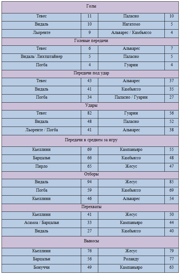 В нападение у «Ювентуса» постепенно сыгрался дуэт форвардов. Льоренте и Тевес на двоих отметились 20 взятиями ворот (9 и 11 соответственно). Роль Карлоса к тому же не ограничивается забиванием мячей. Он кроме голов лидирует еще по трем показателям, таким как: голевые передачи – 6, передачи под удар партнерам – 43 и удары по воротам – 82. Сдержать Тевеса будет очень сложно, он и Видаль представляют основную угрозу для обороны гостей. Справляться с ними придется в первую очередь центральным защитникам «Интера». В этой линии у миланцев особенно выделяется Жесус, он является наиболее стабильным защитником в команде и занимает первые места сразу по трем основным оборонительным показателям: отборам – 85, перехватам – 50 и выносам – 79. Кроме него важная роль в обороне «Интера» отведена Кампаньяро. Аргентинец владеет отличным пасов и чаще других начинает атаки (55 передач – лидер команды), кроме того он неплох при перехватах (44 – второй) и выносах (63- третий).