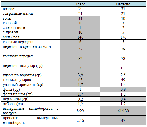 При всем том, что Паласио является очень неплохим нападающим, способным как завершить атаку (10 голов, 2,5 удара), так и создать момент для партнеров (1,3 передачи под удар, 5 голевых) ставить его в один ряд с Тевесом не стоит. Он практически по всем показателям уступает Карлосу, начиная с результативности (10 мячей против 11, 176 минут на гол против 146 и 5 ассистов против 6) и заканчивая ударами по воротам, их точности (2,5 при 49% против 3,9 при 65%), количеством созданных моментов для партнеров (1,3 против 2 в среднем) и числом успешных обводок (1,4 против 1,7). По манере эти нападающие очень похожи, они умеют играть в пас (выполняют около 30 передач за встречу), способны как взять инициативу на себя, так и помочь одноклубнику отличиться, но Тевес является футболистом более высокого уровня, что и подтверждает статистика. Он активнее, стабильнее и точнее в решающие моменты.