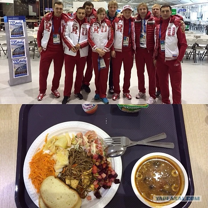 Наши спортсмены, как и полагается хозяевам, уже давно освоились и демонстрируют свой «обед чемпиона». Скобрев: «#олимпийскаястоловая»