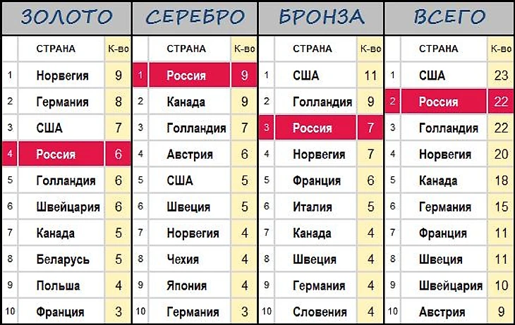 Очень даже хорошие результаты. По сравнению с Ванкувером так просто чудесные. Хотя стоит признать, что Мутко подсуетился и к нам вовремя пришли Волосожар, Ан, Уайлд. План выполнен, а дальше хоть трава не расти...А вообще отличные игры получились, несмотря на хоккеистов, биатлон и прочие плющенки...