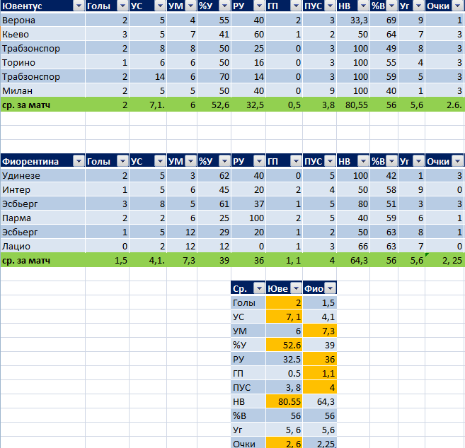 УС – удары в створ; УМ – удары мимо; %У – точность ударов; РУ – реализация ударов; ГП – пропущенные голы; ПУС – удары в створ соперника; НВ – надежность вратаря; %В – процент владения мячом; Уг – угловые
