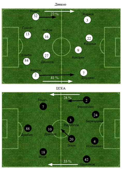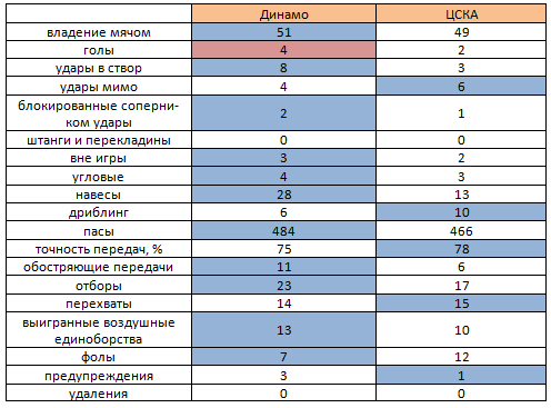 Конечно, нельзя говорить, что хозяева доминировали на поле. По сути, игра разбилась на 2 отрезка ровно разделенных перерывом: в первом с пультом сидел Слуцкий и контролировал ход поединка, а во втором управление перешло к Петреску, причем Дан оказался более амбициозным человеком. Сначала его команда сравняла счет, а затем, отправив еще 2 мяча в сетку ворот Акинфеева, не оставила гостям ни одного шанса. Если говорить о статистике, то ключевыми показателями, характеризующими превосходство «Динамо» стали: удары в створ (8 против 3), навесы (28 против 13), отборы (23 против 17) и, естественно забитые мячи (4 против 2). Также стоит отметить, что подопечные Петреску показали более командный футбол, что подтверждают их 11 обостряющих передач против 6 у соперника. Игроки ЦСКА часто сбивались на индивидуальные действия, об этом нам и говорят 10 успешных обводок (у хозяев – 6).