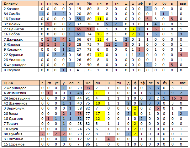 Теперь изучим индивидуальные показатели игроков, которые представлены в таблицах ниже.