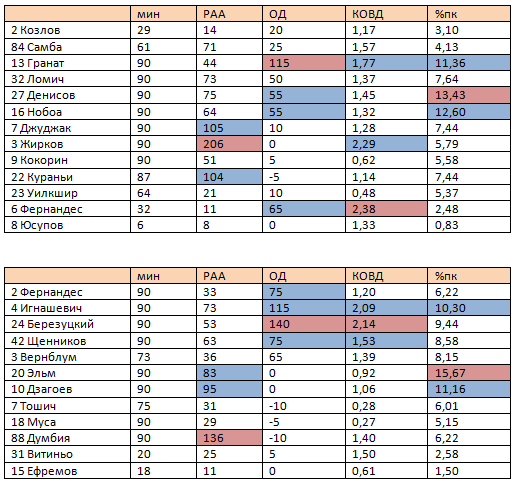 Не лучше дела обстояли у «армейцев» и в центре поля. Дзагоев и Эльм сосредоточились на распасовке и совсем позабыли про оборону. Если для Алана это было простительно, все-таки основной его задачей являлось подносить снаряды нападению, то вот Расмус серьезно разочаровал: 1 перехват и 1 вынос для опорника – это непростительная роскошь. Из-за такой игры партнеров огромное давление обрушилось на Вернблума. Понтус хотя и стал лучшим в команде по отборам – 5 и сделал 2 перехвата и 1 вынос, но обезопасить своих защитников не смог. Щенников, Березуцкий, Игнашевич и Фернандес трудились в поте лица. У Василия и Сергея на двоих набралось 6 перехватов, 5 отборов, 2 заблокированных удара и целых 25 выносов, естественно, они не железные, поэтому логично, что были допущены ошибки. Березуцкий потерял Кураньи в моменте с первым голом в ворота Акинфеева, а Игнашевич был ближе всех к Самба, когда тот сравнивал счет.