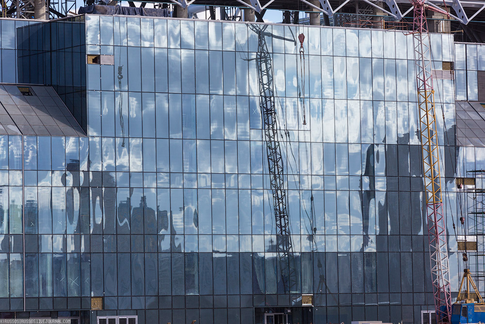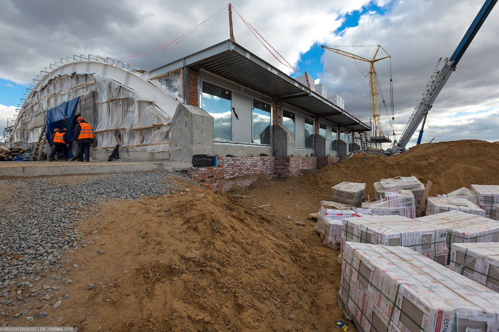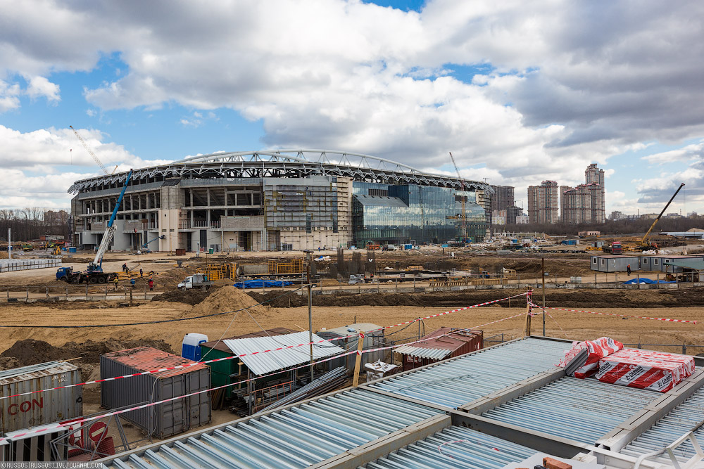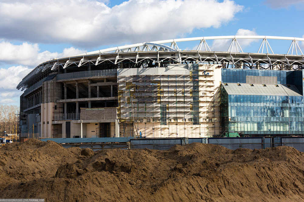 1. На поверхности уже почти готовый стадион. Как написано в вики, «Открытие состоится 24 июля 2014 года товарищеским матчем между «Спартаком» и «Динамо» (Киев)». Теперь, правда, участие киевской команды может быть под вопросом.