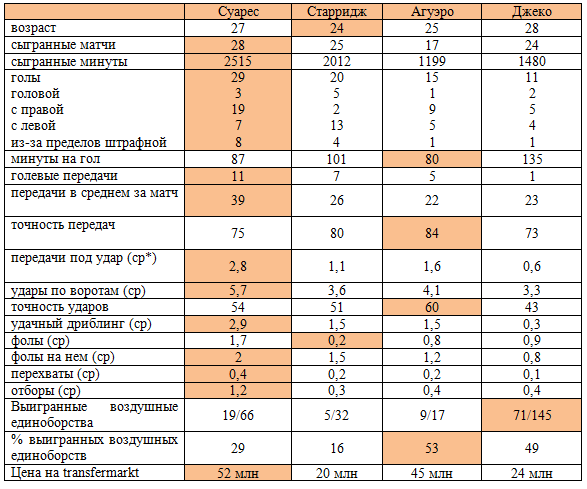 Скорее всего, после травмы вернется на поле Агуэро. Серхио не играл в АПЛ с 29 января, но это не помешало ему с 15 голами остаться в списке лучших форвардов «Манчестер Сити». Дуэль между аргентинцем и Суаресом обещает подарить нам множество ярких эмоций. Естественно, Луис в данном противостоянии выглядит фаворитом, да что там скрывать, уругваец сейчас объективно лучший нападающий в чемпионате Англии и один из лучших в мировом футболе. Он с 29 голами возглавляет бомбардирскую гонку, опережая своего же одноклубника Старриджа на 9 мячей. Суарес не только выделяется своей скорострельностью (забивает каждые 87 минут, наносит в среднем по 5,7 удара за матч), он также отлично умеет действовать в подыгрыше, недаром на его счету значатся 11 голевых передач, к тому же уругваец в среднем создает по 2,8 момента для партнеров. На этом список достоинств Луиса не заканчивается, он также из представленной в таблице четверки чаще других применят дриблинг (2,9 успешные обводки в среднем) и усерднее работает в обороне, что подтверждают 1,2 отбора и 0,4 перехвата. В общем, цифры лишний раз показывают, почему Суарес на сегодняшний момент лучший нападающий в Англии. К тому же для него практически не существует понятия расстояния, он 8 раз огорчал вратарей соперников дальними ударами. Естественно, от того сумеют ли оборонцы «Сити» закрыть Луиса будет во многом зависеть целостность их ворот. Но не нужно забывать, что в паре с уругвайцем выступает, пусть немного и менее яркий форвард Старридж, который отличается каждые 100 минут, а так как в последних 2 матчах он уходил сухим, то в этом поединке Дэниэл будет из кожи вон лезть, чтобы огорчить вратаря соперника. Кстати, Суарес в последних 6 играх забил 6 мячей и отдал 2 голевые передачи, в том числе оформил хет-трик в ворота «Кардиффа».