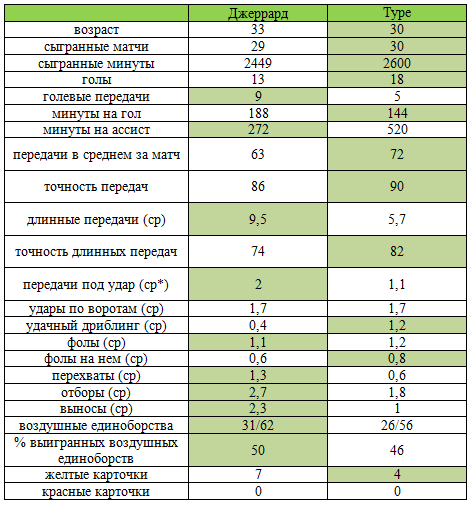 Сразу отметим, что Яя чаще ходит вперед и превосходит Стивена по большинству атакующим показателям. 42й номер «Манчестер Сити» забил на 5 мячей больше, он чаще применяет дриблинг (1,2 раза против 0,4) и раздает в среднем по 72 паса с выдающейся точностью в 90% против 63 и 86%. Джеррард играет более глубоко и в основном связывает оборону и нападение, поэтому неудивительно, что он лучше своего оппонента выглядит в защите, выполняя в среднем по 2,3 выноса, 2,7 отбора и 1,3 перехвата против весьма скромных 1, 1,8 и 0,6 соответственно у Яя. Еще Стивен создает практически в 2 раза больше моментов для партнеров (2 против 1,1 в среднем), поэтому его перевес по голевым передачам (9 против 5), также вполне логичен. В общем, этим парням не раз придется сталкиваться на футбольном поле, Джеррард постарается грамотно отзащищаться и своими передачами помочь партнерам в нападении. Туре в свою очередь будет лезть вперед и его техника и удар непременно доставят множество проблем защитникам хозяев.