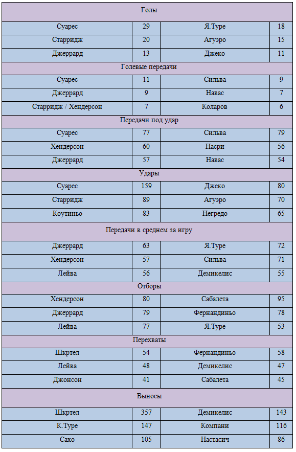 Перейдем к обороне. Наиболее стабильным звеном у команды Пеллегрини в этой линии является правый фланг, за который отвечает Сабалета. Пабло лучше всех умеет отбирать мяч (95 отборов) и идет на 3 месте по перехватам. Еще неплохо себя проявляет Демикелис, он лидирует по количеству выносов (143) и занимает второе место по перехватам (47). Что касается «Ливерпуля», то особенно бросается в глаза количество выносов Шкртела. Мартин 357 раз очищал собственную штрафную площадь, для сравнения у Демикелиса, Компани и Настасича в сумме всего 345.
