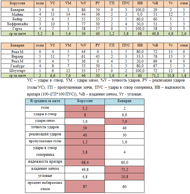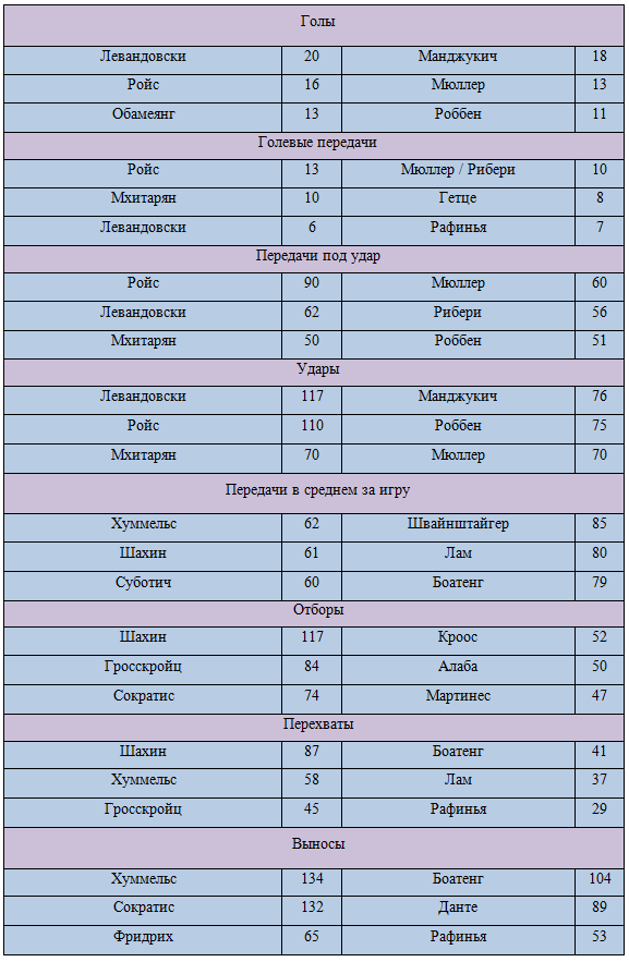 Сколько каждая из команд забила всего на момент сравнения...............получите более объективную оценку! И ........получится , что эффективность игроков атаки Боруссии: Левандовски, Ройса, Мхитаряна, Обамеянга значительно превзойдут их визави из Баварии.