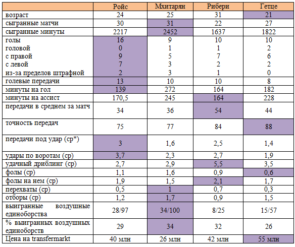Как известно, «Боруссия» на замену Марио приобрела Мхитаряна. Генрих более-менее сумел заменить Гетце. Он чуть больше создает моментов для партнеров (1,6 против 1,4), немного чаще бьет по воротам (2,3 раза против 1,9) и лучше выглядит на втором этаже (34% выигранных единоборств против 26%) и при игре в обороне (1,7 отборов и 1 перехват против 1,5 и 0,3 соответственно). Но есть и минусы. Мхитарян менее результативный игрок, на каждый гол ему в среднем требовалось по 272 минуты, а на голевой пас – 245, у Гетце данные показатели соответственно равны 182 и 228 минутам. Также Генрих реже использует дриблинг (2,9 раза против 3,5). На очную дуэль этих футболистов будет весьма интересно посмотреть.