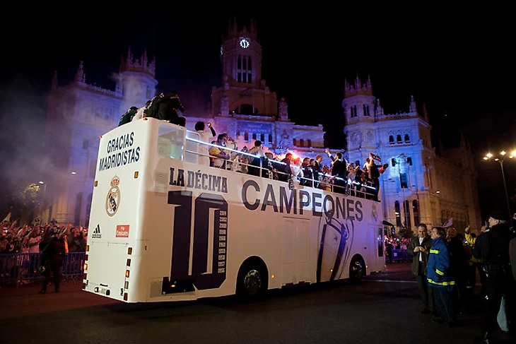 Чемпионский автобус прибывает на площадь Сибелес.