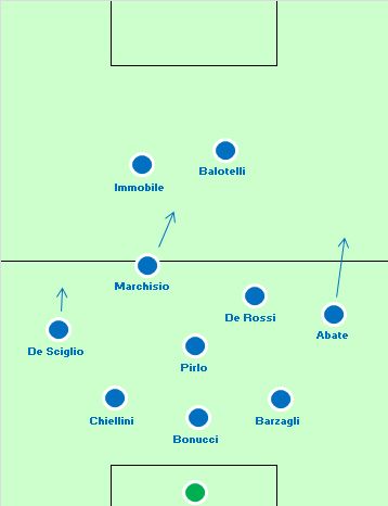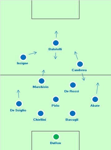 Ни для кого не секрет, что под руководством Чезаре Пранделли итальянцы стали ценителями (но не фанатиками) владения мячом. На попытку угадать стартовый состав «Скуадры Адзурры» должен быть самый большой коэффициент во всех букмекерских конторах – количество вариантов расстановок у сборной Италии стремится к количеству песчинок на пляже Жабоатан-дус-Гуарараписа. Несмотря на то, что Пранделли чаще предпочитает расстановку с четырьмя защитниками, есть сразу несколько причин, по которым он может предпочесть трёх. Во-первых, англичане практически не имеют опыта против подобной расстановки – пространства для скоростных рывков у Старриджа будет мало, и очень многое будет зависеть от вингеров англичан – им надо будет сыграть максимально широко, стараясь разрядить пространство между тремя защитниками, пока латерали возвращаются из позиционных атак.
