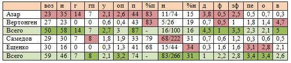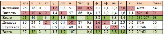 воз – возраст, и – игры, г- гол; гп –голевая передача; у -удары; оп – обостряющая передача (передача, после которой партнер по команде наносит удар), п – передачи всего; %п - точность передач; н –навесы, %н – точность навесов; д - удачный дриблинг (обыгрыш один в один); ф - фолы; зф –сфолили на нем; пе – перехваты; о – отборы; в - выносы мяча из своей штрафной площади; вве – выигранные воздушные единоборства.