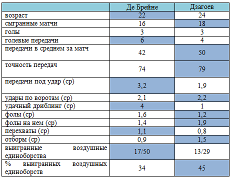 Кстати, подачу в этом эпизоде выполнял Де Брейне – еще один лидер сборной Бельгии. По манере игры Кевин довольно похож на Алана Дзагоева, что собственно и подтверждают цифры ниже.