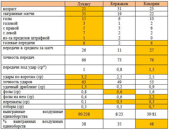 Если сравнить Кержакова с бельгийцем, то Александр уступает ему по всем статьям. Что касается Кокорина, то он на фоне Ромелу выглядит чуть лучше, по крайней мере, Александр превосходит Лукаку по части умения играть в пас. Он провел на 9 матчей меньше, что не помешало ему отметиться 6 голевыми передачами, также он создает в среднем за матч по 1,5 моментов для партнеров (против 1 у оппонента). Еще отметим, что Кокорин более старателен в обороне и чаще заставляет соперников на себе нарушать правила (2,2 фола в среднем). В общем если бы все решали цифры, то выбор очевидно бы пал на Кокорина, но с учетом того, что Александр не лучшим образом себя проявил в последнем матче сборной, Капелло вполне может выпустить Кержакова.