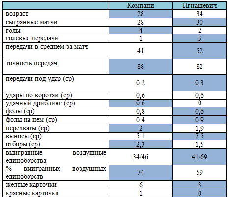 Как это неудивительно, но Игнашевич мало в чем уступает Компани. Оба этих защитника отличаются высокой результативностью. Венсан собрал коллекцию из 4 голов и 1 голевой передачи, а у Сергея 2 + 3. Что же касается оборонительной работы, то Компани обладает более высокой скоростью, что позволяет ему лучше действовать на перехватах (2 против 1,9) и при отборах (2,3 против 1,5) мяча. Игнашевич в свою очередь прекрасно читает игру и отличается умением выбирать позицию на поле, поэтому логично, что он превосходит бельгийца по количеству выносов (7,5 против 5,1), хотя в воздухе все-таки увереннее себя чувствует Венсан (74% выигранных единоборств против 59%). Соперники достойны друг друга. Посмотрим, кто из них совершит меньше ошибок.