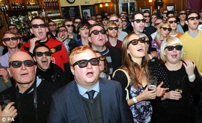 Футбольные болельщики наблюдают трехмерную трансляцию матча между "Арсеналом" и "Манчестером Юнайтед" в лондонском пабе.
