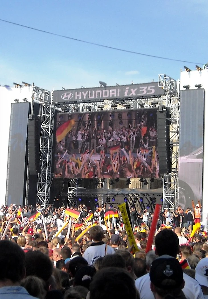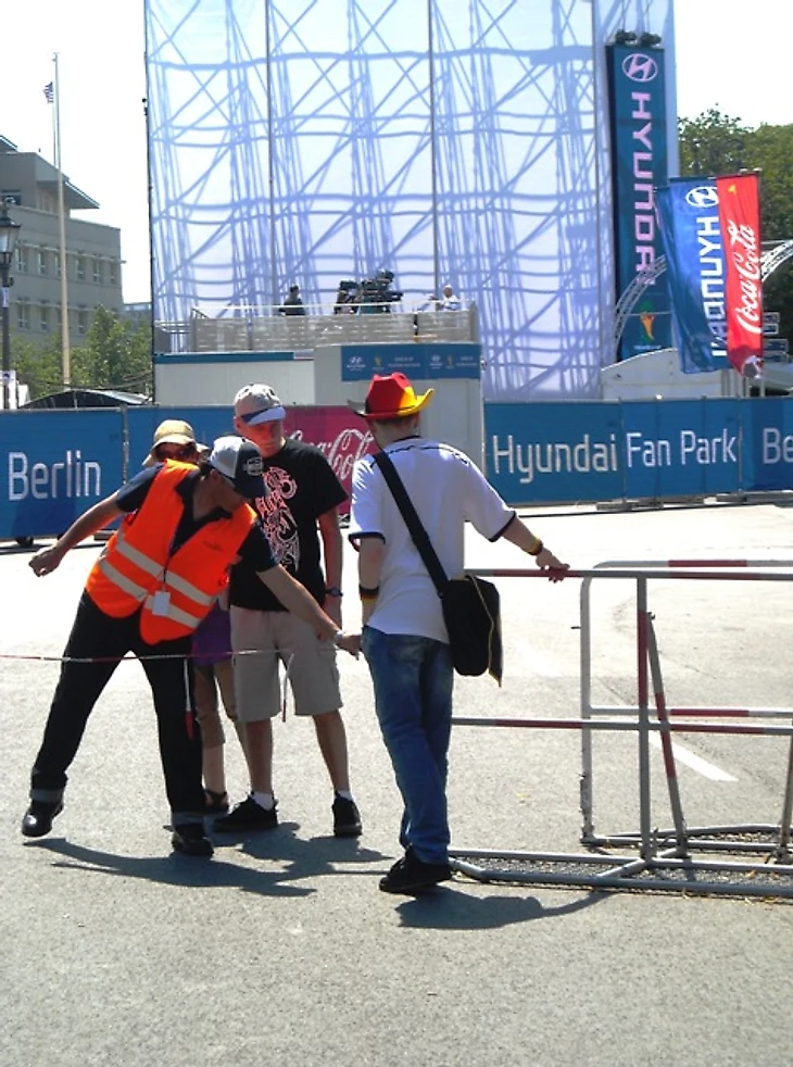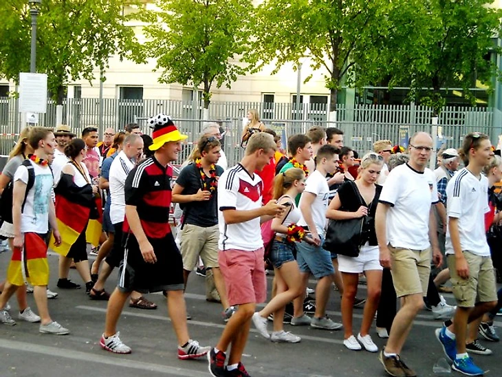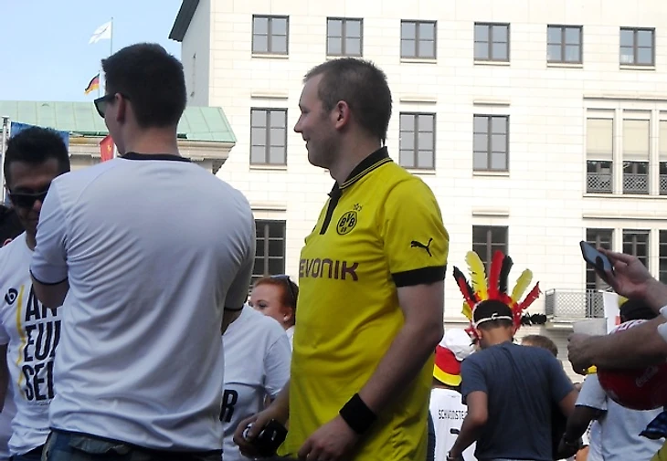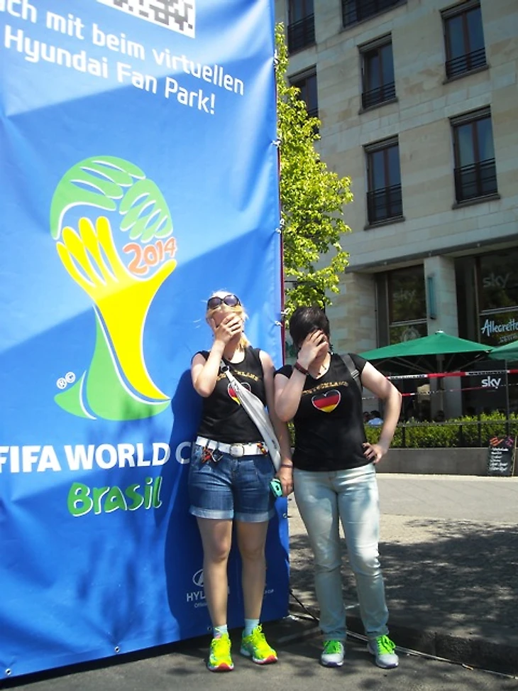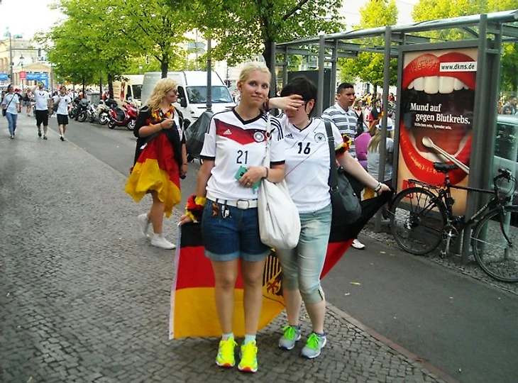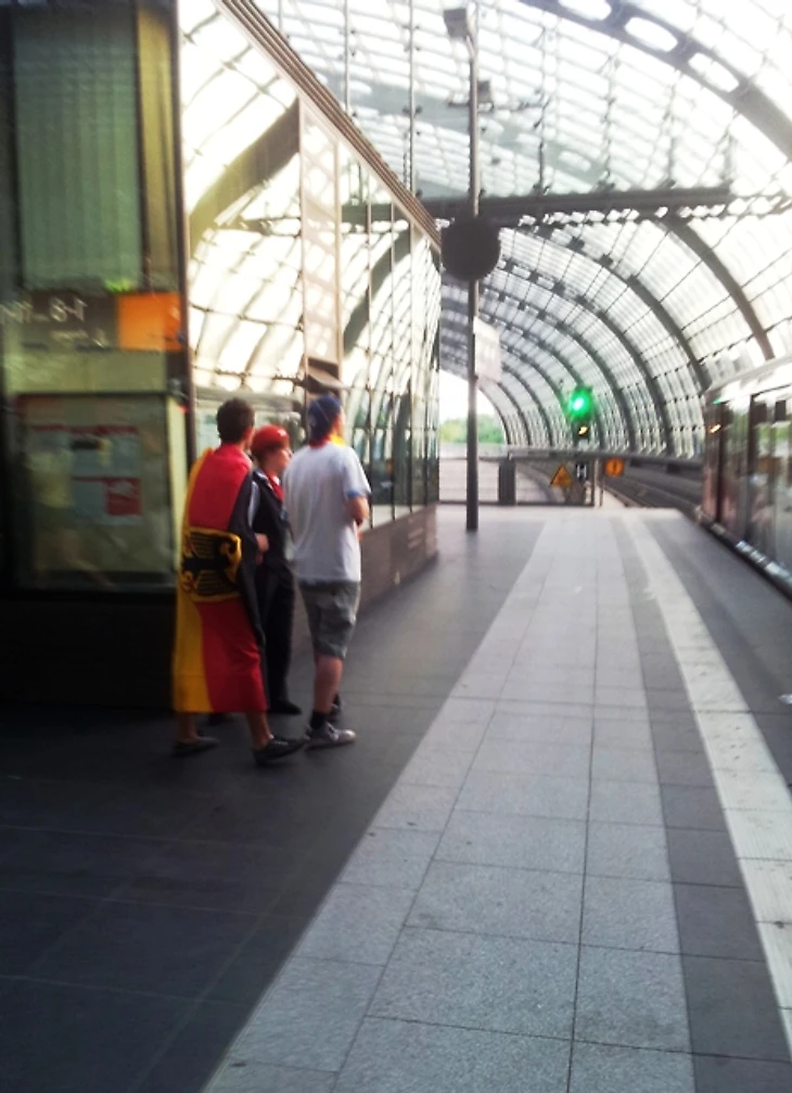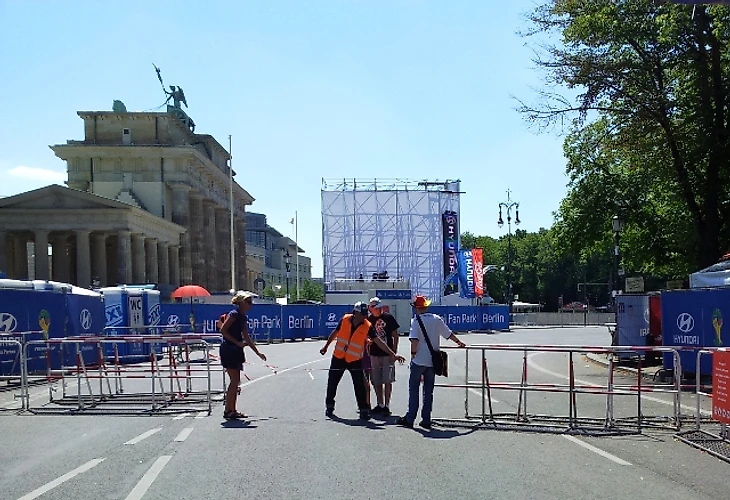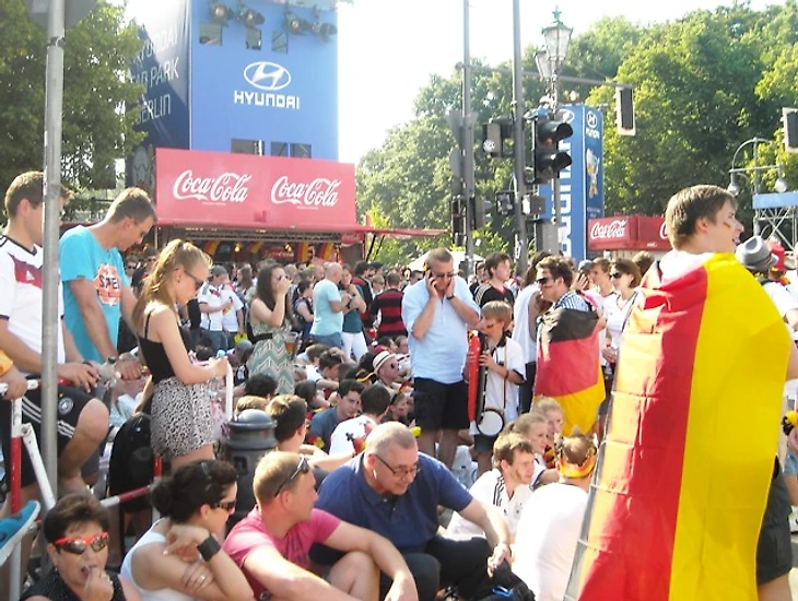 Долго задерживаться в отеле мы не стали, чтобы прийти в фан-зону заранее хотя бы по своим, русским меркам. Скажу честно – до сих пор совершенно не понимаю, с чего мы решили, что главная фан-зона Берлина располагается на станции Alexanderplatz. Размышляя по пути к метро, идти нам туда или к Воротам, мы решили выбрать что покруче, но приехав на нужную станцию, с удивлением обнаружили, что площадь там не очень большая и каких-либо признаков фан-зоны не наблюдается. Да и болельщиков здесь почти не было, а те, что были, посиживали в открытых кафе, явно собираясь смотреть игру там. Почесав в затылках, мы остановили первых подвернувшихся под руку немцев и спросили, как дойти до фан-зоны. До сих пор очень интересно, о чем подумали юноша с девушкой, глядя на трех девчонок, с головы до ног увешанных немецкой атрибутикой и при этом не говорящих по-немецки. Да еще и находившихся за два часа до начала матча, как выяснилось, в получасе пути от фан-зоны, которая, разумеется, была одна и располагалась у Ворот, о чем эти двое нас любезно проинформировали. Чертыхнувшись, мы решили не тратить деньги на метро и пошли пешком, хотя надо сказать, дорога эта красотой не порадовала (узкие улицы и сплошные офисные здания), а солнце палило просто нещадно. Однако мы отнеслись к этому философски, решив, что за сегодняшнюю победу видимо надо чем-то заплатить.