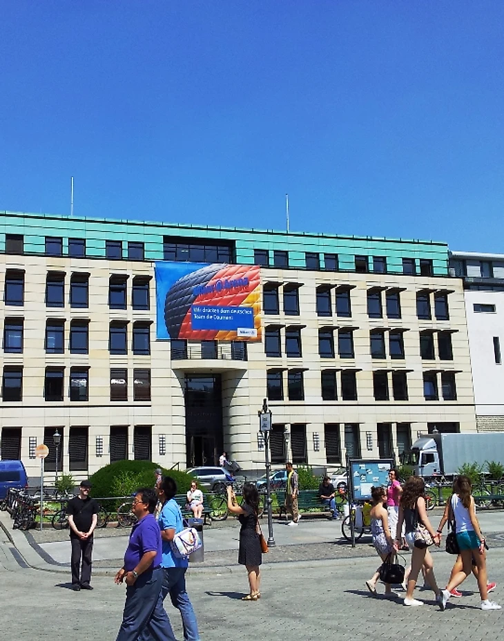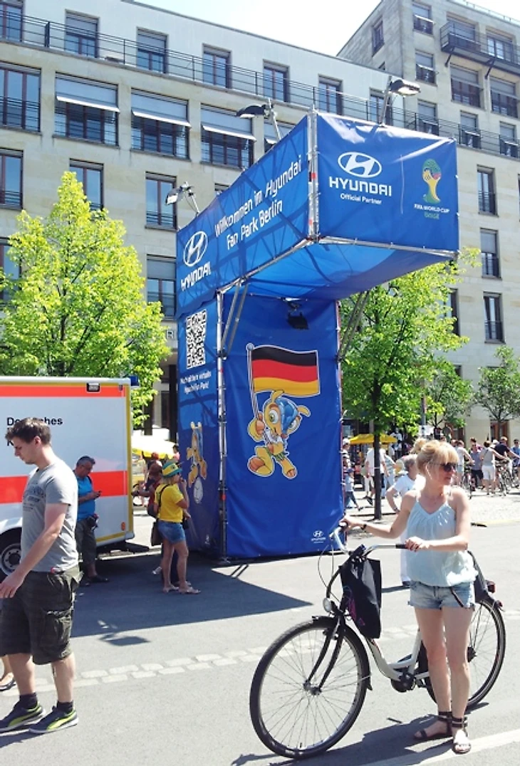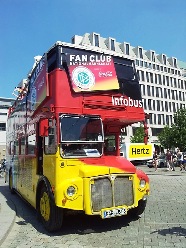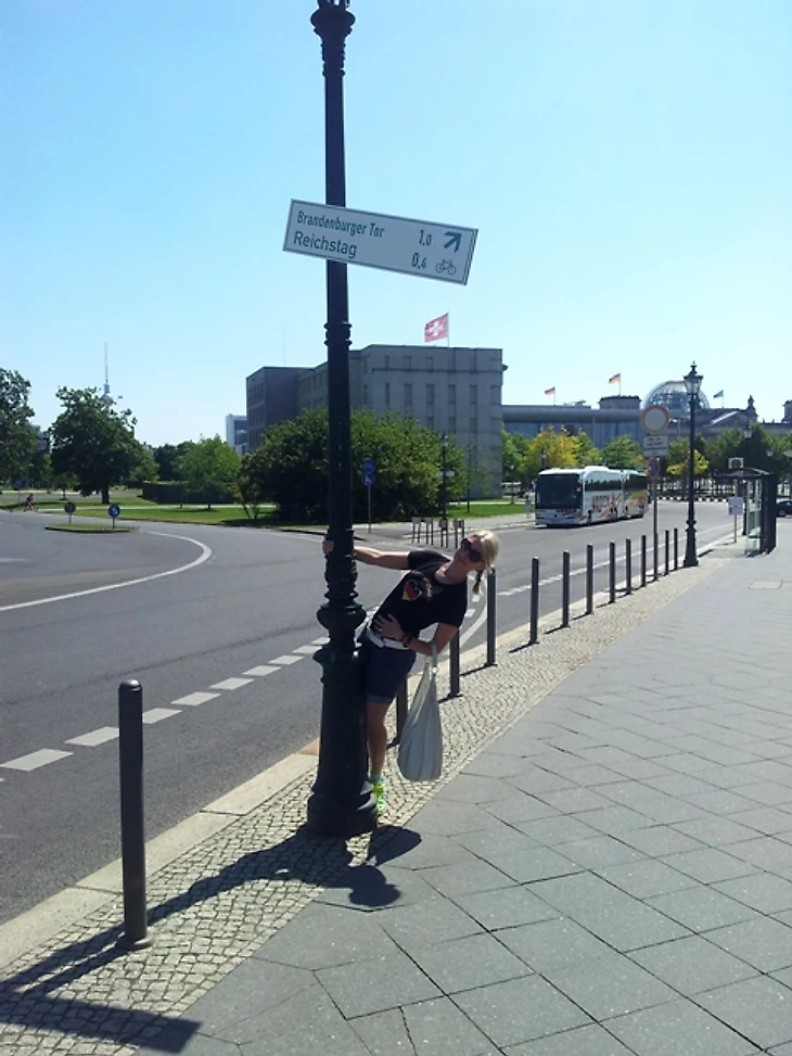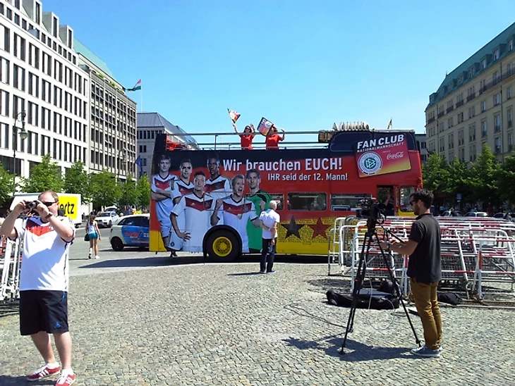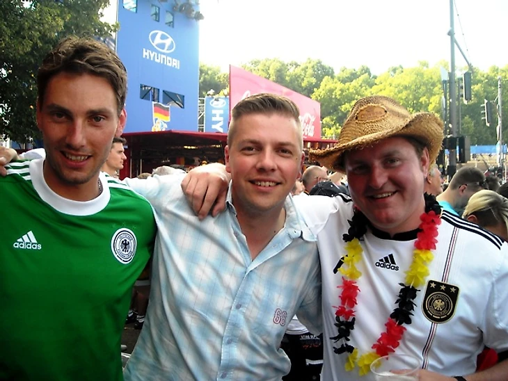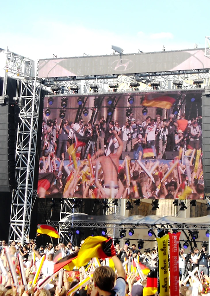 Долго задерживаться в отеле мы не стали, чтобы прийти в фан-зону заранее хотя бы по своим, русским меркам. Скажу честно – до сих пор совершенно не понимаю, с чего мы решили, что главная фан-зона Берлина располагается на станции Alexanderplatz. Размышляя по пути к метро, идти нам туда или к Воротам, мы решили выбрать что покруче, но приехав на нужную станцию, с удивлением обнаружили, что площадь там не очень большая и каких-либо признаков фан-зоны не наблюдается. Да и болельщиков здесь почти не было, а те, что были, посиживали в открытых кафе, явно собираясь смотреть игру там. Почесав в затылках, мы остановили первых подвернувшихся под руку немцев и спросили, как дойти до фан-зоны. До сих пор очень интересно, о чем подумали юноша с девушкой, глядя на трех девчонок, с головы до ног увешанных немецкой атрибутикой и при этом не говорящих по-немецки. Да еще и находившихся за два часа до начала матча, как выяснилось, в получасе пути от фан-зоны, которая, разумеется, была одна и располагалась у Ворот, о чем эти двое нас любезно проинформировали. Чертыхнувшись, мы решили не тратить деньги на метро и пошли пешком, хотя надо сказать, дорога эта красотой не порадовала (узкие улицы и сплошные офисные здания), а солнце палило просто нещадно. Однако мы отнеслись к этому философски, решив, что за сегодняшнюю победу видимо надо чем-то заплатить.