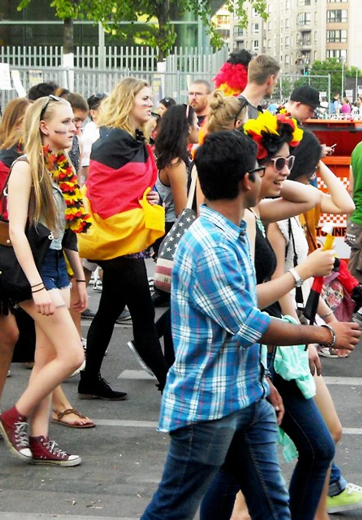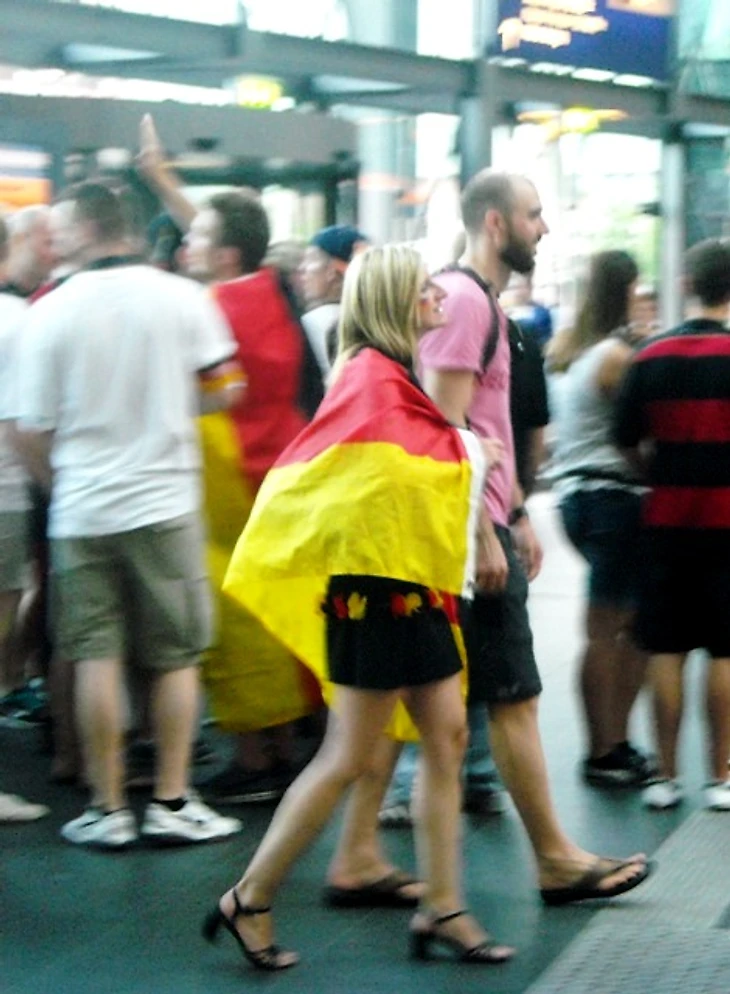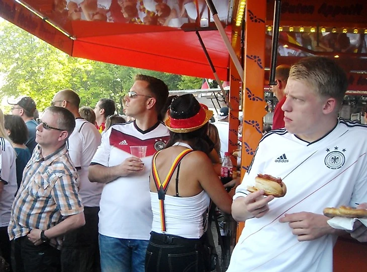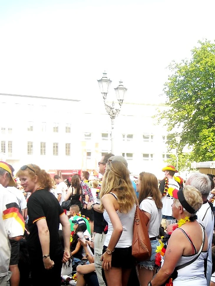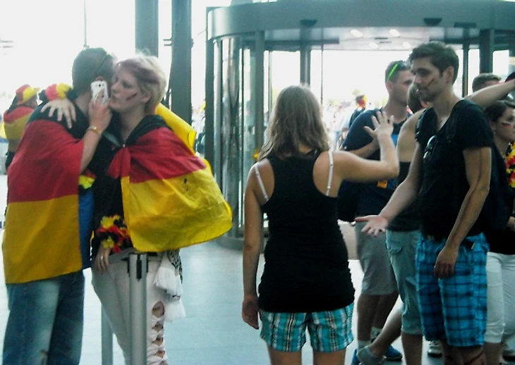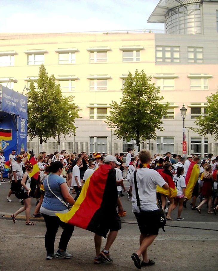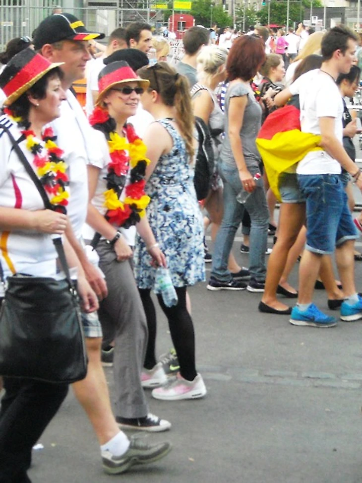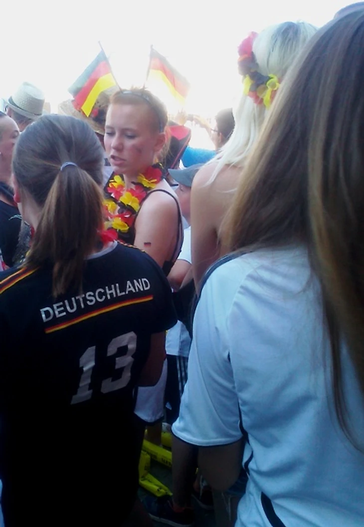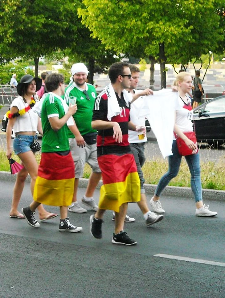 Скажу честно – направляясь на матч, я была преисполнена мрачных ожиданий. Неубедительная игра сборной, всеобщий хор после матча с Алжиром о том, что Франция даст нам прикурить, невольно настраивали на пессимистичный лад. Я была рада уже тому, что бундестим прошла в четвертьфинал, потому что мы получили возможность сходить здесь хотя бы на один их матч и поболеть за них вместе с парой сотен тысяч единомышленников. Я была благодарна высшим силам уже за это, но, оглядывая сейчас толпу, я вспомнила флажочки на стеклах машин и в витринах магазинов, флаги в окнах домов и вдруг поняла, что ужасно не хочу, чтобы все это закончилось уже через пару часов. Очень, очень захотелось победы сегодня – ведь тогда впереди еще точно будет два матча – либо финал, либо за третье место. А глядя на эту веселую, смеющуюся толпу, предвкушающую игру, я не могла даже попытаться поверить в то, что в утешительном матче они будут болеть за свою команду меньше, чем сейчас.