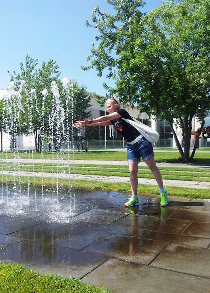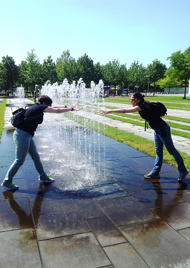 Пройдя дальше по улице, мы вышли на симпатичную площадь с фонтанами, в которые, с учетом своего русского происхождения и суровой жары, разумеется, не могли не залезть.