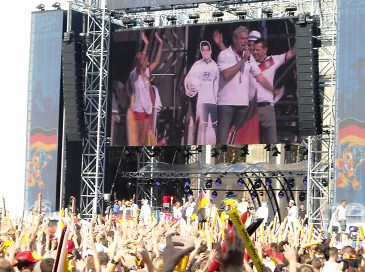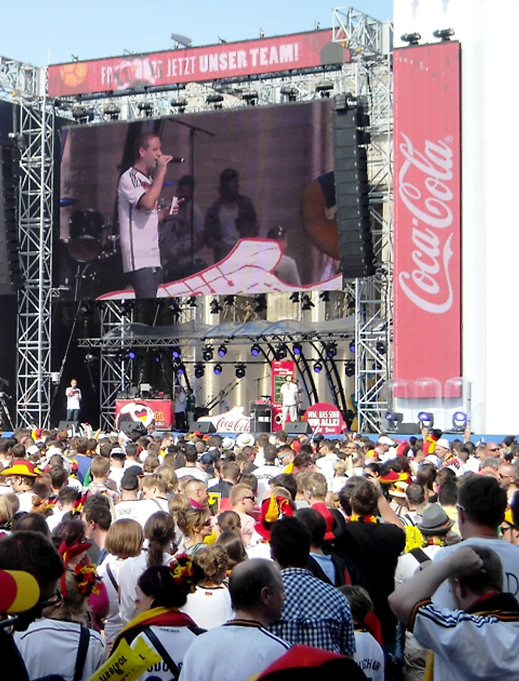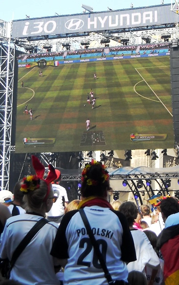 Позавидовав счастливчикам, неплохо устроившимся в рекламном щите, мы нашли себе свободное пространство возле палатки с сосисками. Болельщиков до матча развлекала установленная перед экраном сцена, где заводилы вели разогрев, проводили конкурсы и заранее играли предстоящий матч в «Фифу». Выиграла, к слову, Германия, и, к слову, с тем же счетом 1:0.