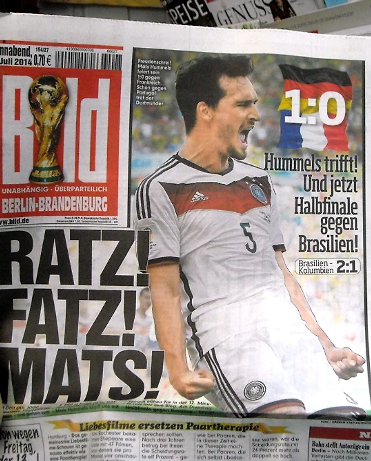 Если пламенная речь Лева о том, что Лам нужен ему в полузащите, заставившая содрогнуться от ужаса всех болельщиков манншафт, была своеобразным обманным ходом, то это однозначно была лучшая хитрость Йоги за всю его карьеру. Не могу даже сказать, что игра была слишком нервной – восторженный вопль фан-зоны и скандирование фамилии Хуммельса, пожалуй, стало самым эмоциональным моментом матча. Впрочем, веселили нас наши соседи спереди – при полном параде болевшие за французов, распевавшие песни про Карима Бензема и весь матч мешавшие мне смотреть игру роскошными головными уборами.