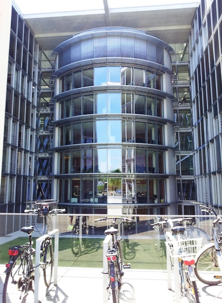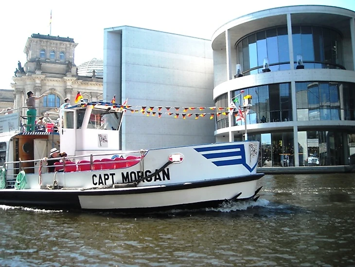 Двери многих зданий выходят прямо к ступенькам, ведущим к воде. Посидев на них и полюбовавшись прогулочными катерами, тоже украшенными флагами (на одном, к слову, даже наличествовал флаг дортмундской «Боруссии», но, как мы не гнались за ним, на радость случайным зрителям, сфотографировать не успели), мы вышли на площадь перед главным правительственным зданием.