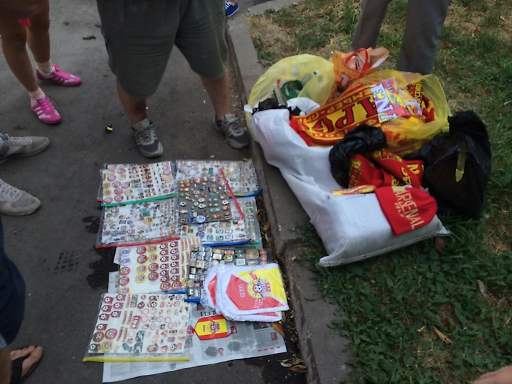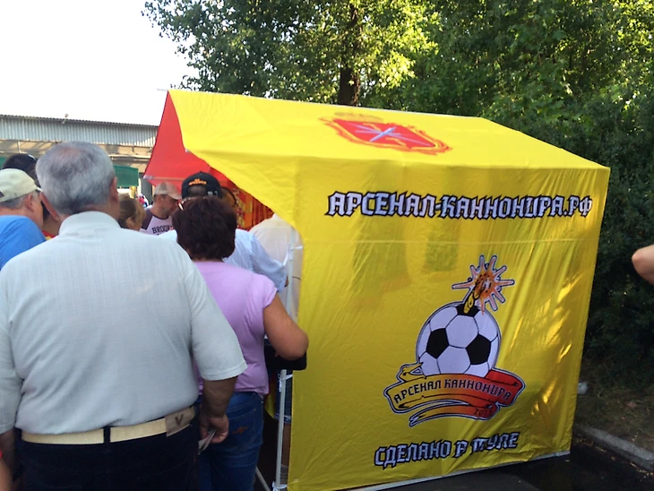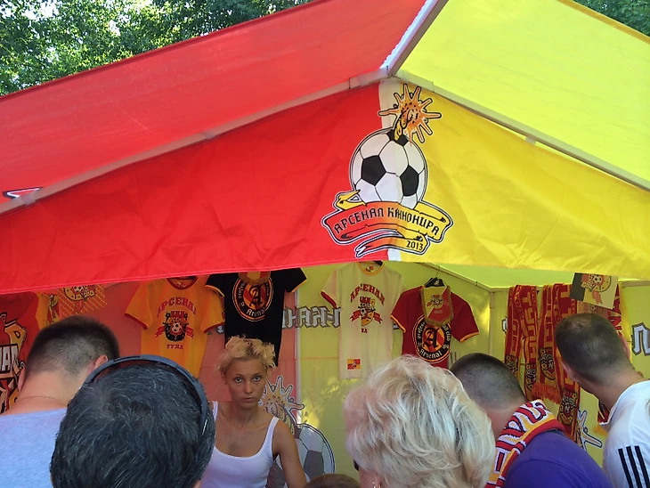 Большая часть аудитории первого матча «Арсенала» в премьер-лиге была прилично экипирована, но даже если запасов атрибутики не хватало – ее можно было свободно купить на подступах к трибунам. Около стадиона работали несколько палаток, и во все стояли приличные очереди. Толпились болельщики и около развала с памятными значками «Арсенала».